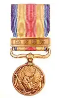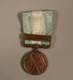 The China Incident Medal (支那事変従軍記章, Sina jihen jūgun kishō) medal was created by Imperial Edit No. 496 on July 27, 1939;[10] and was awarded for service in China at any time from the 12th through the 20th years of the Shōwa period -- Shōwa 12-20 (1937–1945).[11] An amendment was promulgated by Imperial Edict No. 418 in 1944; and the decoration was abolished in 1946 by government ordinance No. 177.[10]