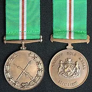 The Military Rule Medal was instituted by General Holomisa to commemorate the coup d'état. While the medal is known to have been instituted and awarded, no warrant has yet been traced.[1][6]