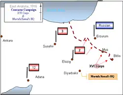 When Mustafa Kemal was assigned to his new post, the Second Army was facing the Russian army under General Tovmas Nazarbekian, the detachment of Armenian volunteer units commanded by Andranik Ozanian and the Armenian irregular units which were in constant advance. After the Siege of Van an Armenian provisional government under the leadership of Aram Manukian was formed with a progressive autonomous region.[10] The Armenian administration had grown from its initial set-up around Lake Van.[11] The initial stages of the Battle of Bitlis and the Battle of Muş were already developed. On arrival Kemal found chaotic conditions. The region was inhospitable at the best of times.[12] Communication lines were under insurgency attacks. Hundreds of thousands of refugees, many of them Kurds, which had bitter relations with Armenian units, came flooding in front of the advancing Russian armies.[13] Mustafa Kemal's initial task was to bring order to the frightened people so that his corps could function during this period of human suffering.