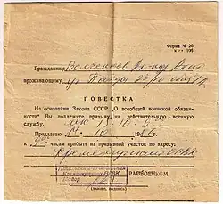 Military commissariats organised the mobilisation of troops before the Soviet invasions of Finland, Poland and other countries in 1939 and in the subsequent outbreak of World War II.[4] As part of recruitment processes and to encourage military service and participation in World War II military commissariats would organise dispatch centres in their individual districts that displayed various propaganda materials such as portraits of Soviet leaders and slogans that encouraged defence of the homeland.[4] Additionally, military commissariats would organise local military functions, military discussions, artistic performances and film screenings to increase morale and to promote military service.[4]