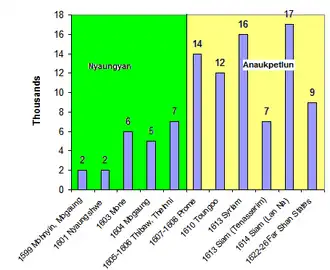 Four Burmese armies invaded northern Siam in November 1563, and had overcome Siamese stands at Kamphaeng Phet, Sukhothai and Phitsanulok by January 1564. Armies then came down on Ayutthaya but were kept at bay for days by Portuguese warships and batteries at the harbour. Siamese defences collapsed after the Burmese captured the Portuguese ships on 7 February 1564 (Monday, 11th waning of Tabodwe 925 ME). King Maha Chakkraphat of Siam surrendered on 18 February 1564 (Friday, 8th waxing of Tabaung 925 ME).[71] The king and crown prince Ramesuan were brought back to Pegu as hostages. Bayinnaung left Mahinthrathirat, one of Maha Chakkraphat's sons as vassal king, along with a garrison of 3,000 men.[72]