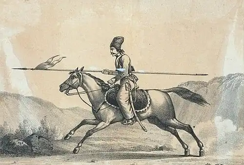The Afsharid army was always a primarily cavalry-based force. It peaked at 375,000 men in 1743, an unsustainable figure that led to the collapse of the empire's economy.[4] Its most notable change compared to the Safavids was the use of firearms. While the Safavids had established a core of musketeers and artillerymen in the 16th century, up to the mid-18th century these men were outnumbered by hosts of mounted warriors armed with lances, swords, and bows supplied from the nomadic and semi-nomadic tribes of the regions. Many of the Shah's household troops continued to be equipped with the same traditional weapons, eschewing the carbines and pistols taken up by European cavalry in the same period.[5] It was under Nader Shah that the majority of troops in the army were equipped with firearms for the first time, necessitating a greater emphasis on drill and training, characteristic of developments that had taken place in Europe in the previous century.[6]