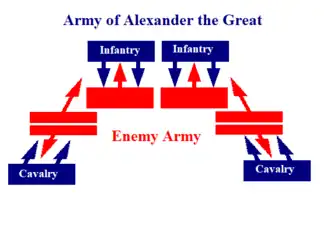 The tactical use of this cavalry was based on the Achilles heel of the phalanxes. Their vulnerability in the flanks and rearguard—it was practically impossible to pivot to stop a flank and rearguard attack due to the hindrance of the sarissas.[7] The destructive effect of the phalanx was due to the cohesion of the hoplites during the impact, a cavalry attack from the flanks or from the rearguard was likely to disorganize the formation and make it vulnerable during the impact against another phalanx. It was the combination of phalanx and cavalry in the tactics of the hammer and the anvil that provided the decisive tactical advantage to the armies of Alexander the Great and that was the basis of the conquest of his immense empire.