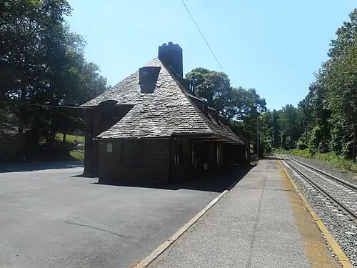 In November 1892, it was renamed Mill Neck station and was moved to the Mill Neck Road crossing and a depot building was built.[2] The building burnt down on April 3, 1911.[3] It was rebuilt in 1912 east of Mill Neck Road and north of the tracks. The two-story brick and stone structure was designed by Harrie Lindeberg at a cost of $26,950, funded by local residents and later given to the railroad.[2]