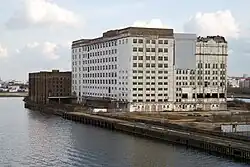 The Royal Docks closed in 1981,[14] and many businesses relocated to Tilbury.[4] The London Docklands Development Corporation (LDDC) was in discussion in the 1990s with the Zoological Society of London for a public aquarium on the site of the former CWS mill, but funding for it was difficult to find and the idea was eventually shelved.[4] The Rank and CWS mills were demolished by the LDDC in the 1990s, along with the Millennium Mills' B and C silos. The D silo to the south is Grade II listed.[15] Millennium Mills itself is locally listed by Newham Council.[16]