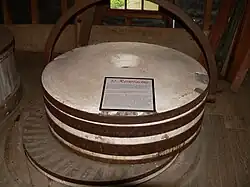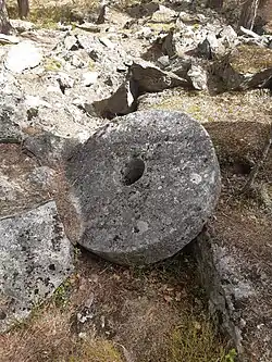An example of this type of millstone can be found as early as the Classical era, used to grind ore in the Laurion mines,[27] although it did not overtake the less efficient reciprocating millstone.[28] Despite its qualities, it didn't really spread throughout the Roman world until later.[27] They were found throughout the Mediterranean basin, but never in very large numbers, except in Italy. Their very high cost - 1,250 denarii in the Late Roman period, compared with 250 denarii for hand millstones - meant that they were only used by millers and bakers. In Gaul, millstones are known from Lyon, Saint-Raphaël, Paris, Amiens and Clermont-Ferrand, all fashioned from basalt from the Eifel, Volvic or Cap d'Agde.[22]