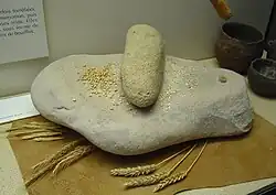 The appearance of flat, elongated millstones in the Natoufian period (Abu Hureïra on the Euphrates) dates back to the 9th millennium BC. They feature larger active surfaces and mark the emergence of a new gesture, that of grinding from front to back, with both hands, which implies a new posture for the body, kneeling in front of the millstone. The appearance of large, asymmetrical, shaped millstones (Mureybet, Sheikh Hassan, circa 10,000 BP) led to the "saddle-shaped" millstones still known today as the metate.[9]