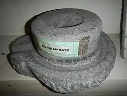 The metate is a nether millstone for domestic use, for grinding corn. It has been used for several thousand years (around 3000 BC) in the cultural area of Mesoamerica, and its name comes from the Nahuatl "metatl".[14]