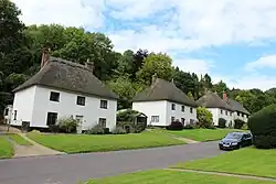 The 36 almost identical thatched cottages were intended to house two families each. They were built from cob and previously were painted yellow, with each house fronted by a lawn; originally a horse chestnut tree was planted between each dwelling.[2] Almshouses and a church were also provided for the new village, sited opposite each other. The almshouses were moved from the old town, where they had originally been built in 1674. The church, consecrated in 1786, is in Georgian Gothic style, with late 19th-century additions.[2]