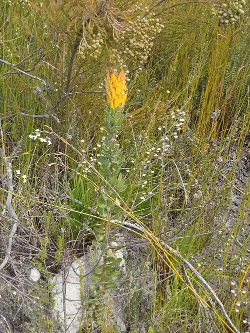 Mimetes pauciflorus, the three-flowered pagoda, is an evergreen, shyly branching, upright shrub of 2–4 (6½–13 ft) high, from the family Proteaceae. It has narrowly to broadly oval leaves of 2½–4 cm (1.0–1.6 in) long and ¾–2 cm (0.3–0.8 in) wide, on the upper parts of the branches, the lower parts leafless with a reddish brown bark. The inflorescences at the top of the shoots are cylinder-shaped, 10–40 cm (4–16 in) long and contain forty to one hundred twenty densely crowded flower heads, at a steep upward angle, hiding a crest of very small, almost vertical leaves. The flower heads each consist of three, rarely four individual flowers. The flowers are tightly enclosed by four or five orange-yellow, fleshy, pointy, lance-shaped involucral bracts, and three orange-yellow, 4–5½ cm (1.6–2.4 in) long bracteoles. It grows on always moist, south-facing slopes in the southern coastal mountains of South Africa. Flowers can be found from August to November, with a peak in September.[3]