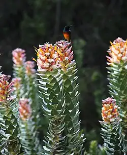 The species is fast growing and relatively short-lived. Specimens were observed to start flowering at an age of around four years. Apparently, it is present in the soil seed bank for decades, until a suitably intense fire triggers germination.[6] Flower heads may develop at any time during the year. It is assumed that like other Mimetes species, the mace pagoda is pollinated by birds and the seeds are distributed by ants.[7]