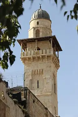 The Ghawanima Minaret or Al-Ghawanima Minaret was built at the northwestern corner of the Noble Sanctuary during the reign of Sultan Lajin circa 1298, or between 1297 and 1299,[4] or circa circa 1298.[5][6] It is named after Shaykh Ghanim ibn Ali ibn Husayn, who was appointed the Shaykh of the Salahiyyah Madrasah by Saladin.[7]