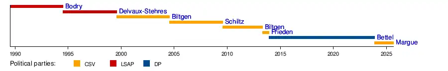 | Elisabeth Margue | CSV | 17 November 2023 | Incumbent | Luc Frieden | |