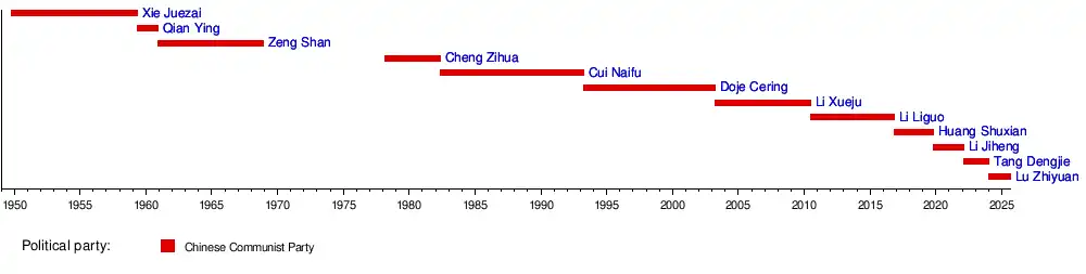 | 6 | | Doje Cering 多吉才让 (born 1939) | 29 March 1993 | 17 March 2003 | 9 years, 353 days | Deputy Director of China International Committee for Disaster Reduction | Li Peng ↓ Zhu Rongji | [7] |