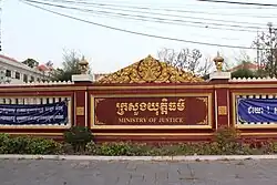 The Ministry of Justice (Khmer: ក្រសួងយុត្តិធម៌, Krâsuŏng Yŭttĕthôrm) provides the administrative framework for the judges and prosecutors such as their professional training and salary and duty allowances.[1] Additionally, with regard to prosecutors, the Minister of Justice is the chief of the prosecution and has the right to issue an injunction (order) to the prosecutions of all level of courts. The General Departments of Prosecutor and Criminal Affairs of the Ministry of Justice is the staff to the Minister of Justice on any related issues.[2]