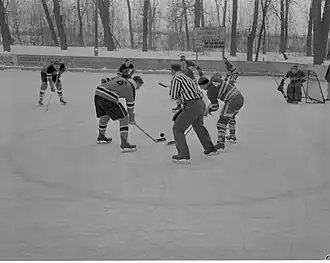 The Mankato State College Indians men's ice hockey team commenced play as a varsity sport in 1969-70.[16] For monetary reasons, the school was not able to play home games in an indoor ice rink, instead opting to build an outdoor rink. At the time, schools with outdoor ice rinks were viewed to be at a competitive disadvantage. For this reason, head coach Don Brose decided the team would compete independent of conference affiliation, as most of the teams in the Minnesota Intercollegiate Athletic Conference had indoor rinks, thus putting MSC at a distinct disadvantage in conference play.[15] The team competed in the NCAA College Division and played their first varsity games against the St. Cloud State Huskies. The Indians' first goal was scored by Jim Lang, though the team lost in a two game sweep.[17] The team rebounded soon after, earning their first win against the Stout State Blue Devils, a game in which MSC's Dave Kramer scored the team's first ever hat trick.[17] The Indians first season was relatively uneventful, as the team finished with a 5-8-1 record. The Indians saw a great improvement in their second season as they only lost two games, en route to a 15-2-1 record, though they did not qualify for the NCAA playoffs.[17] The next several years of Indian hockey were relatively uneventful, though the team did transition into Division II after the 1973 split of the NCAA College Division was split into Division II and Division III.