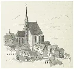 In the following centuries, the church remained to a large extent unchanged, only that in different wars the tower suffered damage several times.[2] Around 1900, the last major changes took place, in particular, the construction of the choir-like sacristy. In the course of the building of underground subways, into the late 1980s, the foundation walls of the long choir were found.