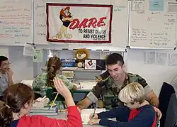 Master at Arms 2nd Class Aaron M. Hendrickson, Naples, Italy area Drug Abuse Resistance Education (DARE) officer, follows along with Justin Goldacker as they work to complete a 2003 lesson in the DARE workbook.