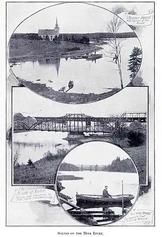 The Mi'kmaq name for the river was 'Sookakade,' meaning 'the silver-place.' One version of source of the river's name is that it was named after a French officer, Lieutenant M. de Mire, in the year 1746.[1] Another source gives the name's origin as having been given by Portuguese fishermen and explorers who may have named it after a place south of Oporto in Portugal.[4] By 1776 the name on maps was 'Miray' and 'Mire.'[1][5][6]