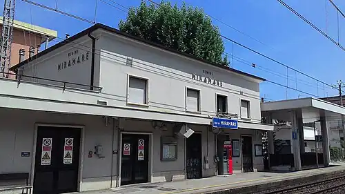 Rimini Miramare railway station (Italian: Stazione FS di Rimini Miramare) is a minor station on the Bologna–Ancona railway.[6] The station is accessed from Viale Ivo Oliveti east of the tracks; a pedestrian underpass allows passengers to cross to the road's western continuation.[60] In 2019, the station had an average weekday passenger entry and exit total of 1,020 in July and 203 in November.[61]