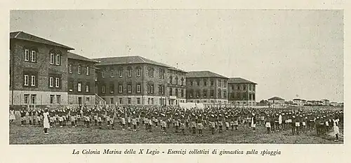 The Bolognese Colony was built between 1931 and 1932 to the design of Ildebrando Tabarroni.[26] During the Second World War, the Bolognese Colony was used to house refugee children from Albania and Libya, as a military hospital for veterans from Operation Barbarossa, a woman's internment camp, and an Allied prisoner-of-war camp. It reopened for children's summer camps after the Second World War.[40] In 2022, the Bolognese Colony was bought by an investor intending to refurbish it into a hotel.[41] The music video to La dolce vita, a pop single by Fedez, Tananai and Mara Sattei that topped the Italian charts in 2022,[42] was filmed outside the Bolognese Colony.[43]