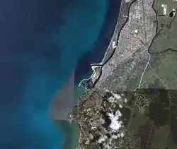 Miri is situated on the alluvial plain of the Miri River on the western shore of northern Sarawak on the island of Borneo. Because of the prevailing southerly off-shore current, beach drift has built up the Peninsula Road as a barrier beach between the Miri River and the shore causing a "Yazoo effect"[56] where the river runs parallel to the coast before breaking through into the South China Sea. The city is predominately located on the inland (east) side of the Miri River with only a few scattered residential neighbourhoods, a Golf Club and a small airstrip on the Peninsula Road.[57]
