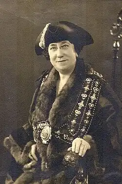 In 1913 not every man had the vote and no woman did. Women were being allowed to take on some positions and in 1913 she elected as the first conservative woman to serve on the poor-law union board of guardians that met in Halifax's St John's Hospital.[2] Her husband suddenly died in 1918 two weeks after he was appointed to direct the National Kitchens Division (with few qualifications apart from his gender).[4] She and her son became directors of the family company.[2]