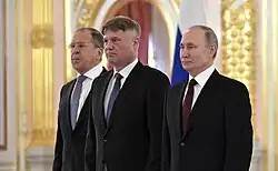Lazanski besides Russian Foreign Minister Sergey Lavrov (left) and Russian President Vladimir Putin, 5 February 2020
