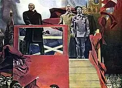 In 1969, working in collaboration with Gennady Mosin, he painted "Civil War Red commanders in the Urals", which depicted Blyukher, Frunze, Chapaev and other Red commanders in the Civil War in the Urals.[10] The painting was displayed at the third regional "Socialist Ural" art exhibition in Chelyabinsk and caused a lot of debates because the style of the painting was very different from Socialist Realism.[22]
