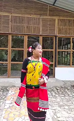 The traditional craft of weaving is a very important aspect of Mising culture.[26] It is an exclusive preserve of the Mising woman, who starts her training in the craft even before she reaches her teens. Men wear cotton jackets (Mibu Galuk), light cotton towels, endi shawls, thick loin cloths, and, occasionally, even shirtings. The sword that mising men carry is called "yoksa" and mising muffler is called "erkok". Women wear variety of clothes.