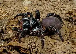 Eastern mouse spiders are often mistaken for Australian funnel-web spiders.[5] The females are large and very strong, with powerful chelicerae.[6] Their fangs often cross over slightly, while those of Australian funnel-web spiders remain parallel,[3] and the latter often have a drop of venom on their fang tips and have longer spinnerets.