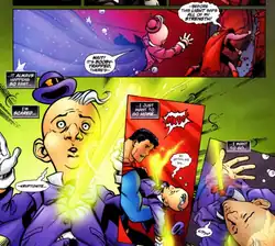 At the same time, Mxyzptlk appeared in Superman/Batman #23, trying to prepare Batman and Superman for the upcoming Infinite Crisis. The incident features alternate universe versions of Superman, Batman, and Deathstroke and implies much chaos that was not shown, such as the planet Mogo visiting Earth to reclaim an old land mass. At the end of this storyline, Mxyzptlk indicates he has erased the knowledge of Superman's identity from Lex Luthor's mind.