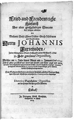 Departure enriched by Peace and Joy of devout old Simeon, on the occasion of the blessed Decease of Master JOHANNIS Buxtehude, in his life time well-respected, highly honourable, and ingenious, for 32 years Organist at the Church of St. Olaf in the royal City of Elsinore, who here at Luebeck, on 22 January in the Year 1674, in the 72nd Year of his Age, with Peace and Joy departed this Life of Anxieties and Alarms, called Home by his Redeemer...