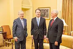 During the first Trump administration, the Senate Republican majority under McConnell's leadership passed the Tax Cuts and Jobs Act of 2017, the Economic Growth, Regulatory Relief and Consumer Protection Act in 2018, the First Step Act, and the Great American Outdoors Act, and confirmed a record number of federal appeals court judges during a president's first two years. McConnell invoked the nuclear option to eliminate the 60-vote requirement to end a filibuster for Supreme Court nominations, after his predecessor Harry Reid had eliminated the filibuster for all other presidential nominations; Trump subsequently won Supreme Court confirmation battles over Neil Gorsuch, Brett Kavanaugh and Amy Coney Barrett. While supportive of most of Trump's domestic and foreign policies, McConnell criticized Trump's attempts to overturn the 2020 presidential election, and despite voting to acquit in Trump's second impeachment trial for reasons related to the constitutionality of impeaching a former president, deemed him "practically and morally responsible" for the January 6 United States Capitol attack.[2] In late 2024, McConnell wrote an essay on his current view of American power and the foreign policy mistakes of former presidents.[3]