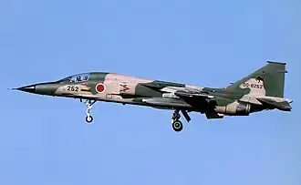 The new aircraft was a minimum change derivative of the T-2, with the rear cockpit being converted to an avionics bay by removing the rear seat, and replacing the canopy with a simple unglazed access hatch.[3] Two additional hardpoints were fitted under the wing to allow carriage of a heavier weapon load, and the avionics were improved,[4] with a new J/AWG-12 radar set, similar to the AN/AWG-12 fitted in British Royal Air Force F-4M Phantom fighter jets.[5] This set provides ranging information. Aside from the avionics changes, deletion of the rear seat, and new one-piece canopy, the only other major change from the T-2 was the strengthening of the airframe to enable it to carry a larger weapons load than the T-2. The F-1 is fitted with an internally mounted 20 mm JM61A1 Vulcan cannon with 750 rounds of ammunition. The aircraft also has seven external hardpoints for the carriage of a wide variety of stores (missiles, gun pods, etc.). The fuselage hardpoint and inboard pair of underwing hardpoints are plumbed for external fuel tanks to increase the aircraft's range. The primary weapon of the F-1 is the ASM-1 and the newer ASM-2 long-range anti-ship missile. This weapon is roughly in the class of the American AGM-84 Harpoon or French AM.39 Exocet. Other weapons carried include the all-aspect short-range heat-seeking AIM-9 Sidewinder air-to-air missile for air-to-air combat. This weapon is carried on the wingtip rails usually, but it can also be carried on the outboard underwing hardpoints for the F-1's secondary air defense role. Other air-to-ground weapons carried include rocket pods (JLAU-3/A) of 70 mm (2.75 in) size as well as bombs of 227 kg (500 lb) and 340 kg (750 lb) in size (Mk82 and M117 respectively). In addition, the Mk-82 and M117 bombs can be fitted with infrared guidance kits, turning them into precision-guided weapons that home in on heat radiation emitted from seaborne targets such as ships or other ground-based targets. When fitted with this kit, the bomb becomes known as GCS-1.