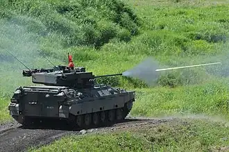 The Mitsubishi Type 89 IFV (三菱89式装甲戦闘車, Mitsubishi 89-shiki sōkō-sentō-sha)(89 FV ) is a Japanese infantry fighting vehicle that entered service with the Japan Ground Self-Defense Force in 1989. There were 58 vehicles in service as of 1999 and a total of 120 produced by 2014 with 300 planned. The main armament of the vehicle is an Oerlikon Contraves 35 millimeter KDE cannon.