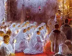 In music, the term Young Poland is applied to an informal group of composers that include Karol Szymanowski, Grzegorz Fitelberg, Ludomir Różycki as well as Mieczysław Karłowicz and Apolinary Szeluto.[5] Almost all educated by Zygmunt Noskowski, the group was under strong influence of neoromanticism in music and especially of foreign composers such as Richard Strauss, Richard Wagner and those belonging to The Mighty Handful group, e.g. Modest Mussorgsky, Alexander Borodin and Nikolai Rimsky-Korsakov.[5]