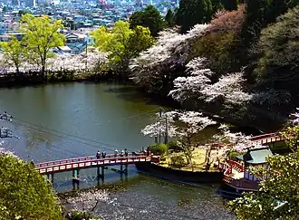 A base for the 252 Air Group of the Imperial Japanese Navy (IJN), a fighter aircraft unit, was established in Mobara.[5] In 1941, by order of the IJN, 100 residences and their associated farmland, schools, town halls, police substations, temples, and shrines were forcibly confiscated without warning to build the base. Mobara Airfield was completed using a kinrō dōin group that consisted of the forced labor of Korean residents in Japan and students from Chōsei Middle School students in 1943. The airfield was located on the east banks of the small Aku River, directly to the east of Mobara Station along the present-day JR East Sotobō Line, and consisted of a runway and 20 structures, some of them concealed underground. Tokubetsu kōgekitai, or kamikaze units, were sent from Mobara Airfield to the IJN Kokubu Air Corps in present-day Kirishima, Kagoshima Prefecture to attack American forces off Okinawa. The United States confiscated the airfield shortly after the surrender of Japan in 1945. Remains of the runway, approximately ten airfield structures, and a tunnel are now on the property of the Mitsui Chemicals.[6][7]