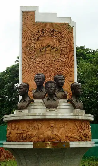 There are five different metal sculptures of Abdus Salam, Rafiq Uddin Ahmed, Abdul Jabbar, Shafiur Rahman and Abul Barkat. These are situated on a base. In the rear part, there is a long wall rising. There are three steps on the upper part of the wall. Both sides of the wall and other brick-made parts are ornamented by frescoes of the Language movement of 1952.