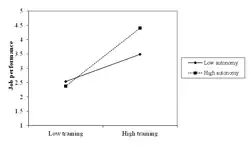 To probe the interaction effect, it is often helpful to plot the effect of X on Y at low and high values of Z (some people prefer to also plot the effect at moderate values of Z, but this is not necessary). Often values of Z that are one standard deviation above and below the mean are chosen for this, but any sensible values can be used (and in some cases there are more meaningful values to choose). The plot is usually drawn by evaluating the values of Y for high and low values of both X and Z, and creating two lines to represent the effect of X on Y at the two values of Z. Sometimes this is supplemented by simple slope analysis, which determines whether the effect of X on Y is statistically significant at particular values of Z. A common technique for simple slope analysis is the Johnson-Neyman approach.[11] Various internet-based tools exist to help researchers plot and interpret such two-way interactions.[12]