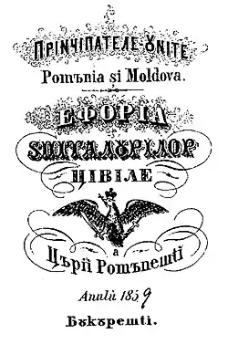 Elsewhere, in 1840 the first page of Iordache Golescu's Băgări de seamă asupra canoanelor gramăticești presented no less than 4 alphabets, and within the text the Cyrillic and Latin letters alternated.[47] Kogălniceanu's Dacia literară and Propășirea had a moderate transitional alphabet, using the Latin D, E, M, N, Z. Only in 1855 România literară were the letters Î, J, S, T added.[48] The Transylvanian Foaie pentru minte, inimă și literatură and Gazeta de Transilvania, edited by Bariț and Cipariu, had the first page printed with Latin letters, then the following in transitional alphabet, sometimes alternating from Latin to Cyrillic from one page to another.[48] In 1856 in Wallachia a law decreed the use of the Latin alphabet for schools and manuals, but retained the letter Ъ.[49] Finally, on 8 February 1860, Ion Ghica decreed the use of the Latin alphabet in Wallachia, a model followed two years later by Moldavia.[50]