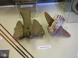 Flight archery relies on the finest in performance equipment, optimized for the single purpose of greater range, using various types of bows (some unusual such as foot bows). The search for better flight archery equipment has led to many developments in archery equipment in general, such as the development of carbon arrows.[3] Flight archery arrows are highly specialized. They are very short (Mahmoud Effendi's was only 14 inches [36 cm]), so that the point of the arrow is inside the arc of the fully drawn bow, requiring a support projecting back from the bow towards the archer to keep the arrow in position, or the use of a 'siper' (Turkish) on the bow hand/wrist on which to rest the arrow.[4] Also, the shafts are 'barrelled', tapering towards both ends from the middle, to reduce both weight and air resistance.