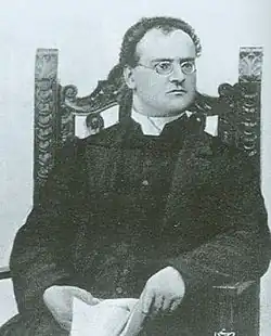 Alfred Loisy was a French Catholic priest, professor and theologian generally credited as the "father of Catholic Modernism".[67][68] He had studied at the Institut Catholique under Duchesne and attended the course on Hebrew by Ernest Renan at the Collège de France. Harvey Hill says that the development of Loisy's theories have to be seen also in the context of France's Church-State conflict, which contributed to Loisy's crisis of faith in the 1880s. In November 1893, Loisy published the last lecture of his course, in which he summed up his position on biblical criticism in five propositions: the Pentateuch was not the work of Moses, the first five chapters of Genesis were not literal history, the New Testament and the Old Testament did not possess equal historical value, there was a development in scriptural doctrine, and Biblical writings were subject to the same limitations as those by other authors of the ancient world.[69][70] When his attempts at theological reform had failed, Loisy came to regard the Christian religion more as a system of humanistic ethics than as divine revelation.[71] He was excommunicated in 1908.[72]