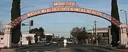 The city's official motto, "Water Wealth Contentment Health," is emblazoned on the downtown Modesto Arch, which is featured in local photographs and postcards. The motto was selected in a contest held in 1911, with a $3 prize for the winner. (The original winning motto, "Nobody's got Modesto's goat",[16] was later declined by town officials.) Modesto's motto is sometimes spoofed as "The land gets the water, the bankers get the wealth, the cows get contentment, and the farmers get the health."[17]
