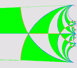 bounded by the vertical lines Re(z) = 1/2 and Re(z) = −1/2, and the circle |z| = 1. This region is a hyperbolic triangle. It has vertices at 1/2 + i√3/2 and −1/2 + i√3/2, where the angle between its sides is π/3, and a third vertex at infinity, where the angle between its sides is 0.