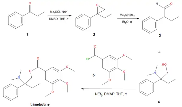 Trimebutine can be synthesised from 1-phenylpropan-1-one (1). Firstly, it is converted to the corresponding oxirane through trimethylsulfoxonium idoide with sodium hydride in DMSO and THF, yielding 2-ethyl-2-phenyl-oxirane (2). Next, 2 undergoes ring-opening with dimethylaluminium N,N-dimethylamide in diethyl ether, yielding 2-(dimethylamino)-2-phenyl-butan-1-ol (4) and 2-phenylbutanal (3) as a byproduct. Then, 4 reacts with 3,4,5-trimethoxybenzoyl chloride (5) in triethylamine and THF, which is catalysed by 4-dimethylaminopyrridine (DMAP), yielding trimebutine.