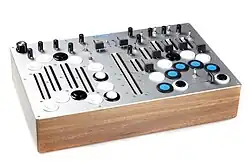 The Frankentroller started as a Novation Remote 25 SL Keyboard; Moldover adapted its hardware to make it a new instrument by adding a Kurzweil keyboard touchstrip, a Korg Kaoss Pad, as well as refashioning some of the keyboards black keys to be used as crossfaders.[9] Ean Golden of Remix subsequently stated that the Frankentroller had earned Moldover wins his personal award for "most creative mod."[8]