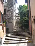 The town hall of Molteno is situated within the park of Villa Rosa. The town centres around the Piazza Risorgimento, from which runs the street up to the Chiesa di San Giorgio on the top of Ceppo hill. From the forecourt and broad steps of the church it is possible to look southwards over a wide panorama of the countryside and of the hill country of the Brianza. The houses cluster in narrow, crooked streets around the slopes and the base of the hill. Another central feature of Molteno is Piazza Europa, which every Wednesday hosts the town market.