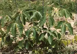 A large, spreading tree, the mongongo reaches 15–20 metres (49–66 ft) tall. The leaves are a distinctive hand-shape, and the pale yellow wood is similar in characteristics to balsa, being both lightweight and strong. The yellowish flowers occur in slender, loose sprays.
