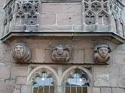 The monastic buildings were located on the north side of the priory church. Traces of an infirmary were discovered in 1906, when the site of the Baptist Church was being prepared for building. The surviving buildings were the prior's lodgings.[1] The only recognisable surviving medieval feature is the "sumptuous mid-C15 oriel window"[1] which is often erroneously described as having a connection with Geoffrey of Monmouth who lived over three centuries earlier,[5] and which in fact is likely to have formed part of the priory gatehouse.[1] The window contains three corbels in the form of carved heads of high quality, although there is some uncertainty as to exactly what they depict: Newman describing them as representing "an angel between a civilian and what may be a bedesman",[1] whilst Kissack is more empathic in suggesting they portray "a knight, an angel and a miller."[6] The prior's lodgings were extended on several occasions in the nineteenth century when they were used as St Mary's National School.[1]